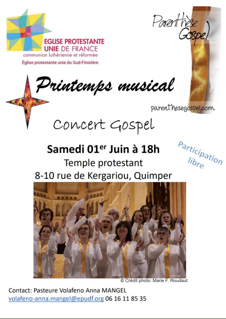 Rendez-vous au temple protestant, 8-10 rue de Kergariou, à Quimper, samedi 1er juin à 18h